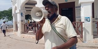 Shee Bwana Shee during interview with Nation.Africa in Lamu. He says he has at one town beaten in the course of his duty, his megaphone smashed and broken with his hand harmed but says he has never given up in performing his duty as it has enabled him sustain his family.