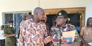Interior Cabinet Secretary Kipchumba Murkomen speaks with Coast Regional Commissioner Rhoda Onyancha during the Jukwaa La Usalama Pwani Edition tour in Mokowe, Lamu, on April 10, 2025. CS Murkomen and RC Onyancha warned chiefs, their assistants, local administrators, police officers, and Lands Ministry officials against abetting land grabbing in Lamu and the wider Coast region.