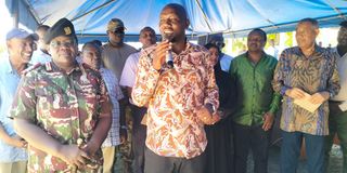 Interior Cabinet Secretary Kipchumba Murkomen speaks during the Jukwaa La Usalama Pwani Edition tour in Mokowe, Lamu, on April 10, 2025. CS Murkomen and RC Onyancha warned chiefs, their assistants, local administrators, police officers, and Lands Ministry officials against abetting land grabbing in Lamu and the wider Coast region.