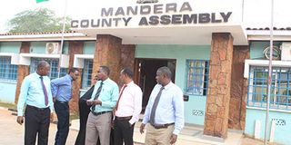 Some of the Mandera County MCAs who have accused the county executive led by Governor Ali Roba of illegally cancelling the recent staff recruitment when the spoke to journalists on June 19, 2019 outside the county assembly. PHOTO | MANASE OTSIALO | NATION MEDIA GROUP