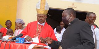 Meru Bishop Salesius Mugambi (left) confers with Fr Peter Mutwiri before reading a statement by Kenya conference of Catholic Bishops outside Christ the King, Kithima parish on July 10, 2022, where the church hit out at the continued spat between President Uhuru Kenyatta and his deputy, William Ruto, saying it could derail quest for peace ahead of August 9th polls.