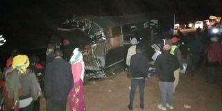 Members of the public at the scene of the accident where at least 11 people were killed after a bus collided head-on with a matatu at Subuiga on the Meru-Nanyuki road on October 8, 2022.