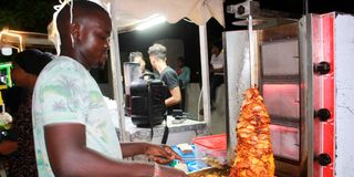 A vendor makes chicken shawarma along the busy Makadara road in Mombasa County for residents to enjoy on March 20, 2024. The delicacies are hard to come by during the daytime due to Ramadhan.