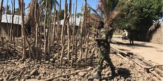 Mozambican Army soldiers bring down a structure torched by attackers to be rebuilt as shelter for people fleeing attacks in Naunde, northern Mozambique, in this photo taken in June 2018.