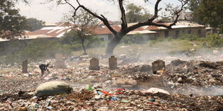 Garbage mounds at Kongowea cemetery in Mombasa. Families who have buried their departed kin at the graveyard want the area protected by fencing to stop illegal activities