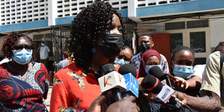 Sauti ya Wanawake activist Luiza Rajab speaks during the Cancer management task force engagement with the public in Mombasa on July 23, 2021. She met Ms Saumu Mbarak, a cervical cancer patient, and offered her support.