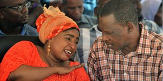 Likoni MP Mishi Mboko chats with Shika Adabu MCA Mwalimu Hamadi during a public participation in readiness for the construction of the second phase of the Dongo Kundu bypass and the Special Economic Zones (SEZs) at Mwangala village in Likoni on Thursday January 21.