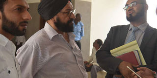Joginder Singh Dhanjal (centre) and his son Kavir Singh (left) chat with their lawyer Mohamed Ali outside the courtroom after the High Court in Mombasa dismissed Ms Nagi’s application. Ms Nagi had sought to have his brother Daljit Singh Dhanjal prosecuted for interfering with their late father’s estate. PHOTO | BRIAN OCHARO | NATION MEDIA GROUP