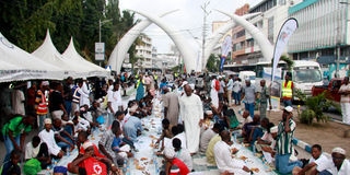 Hundreds of Muslims break their fast in the Pembe ya Ndovu area along Moi Avenue in Mombasa County.