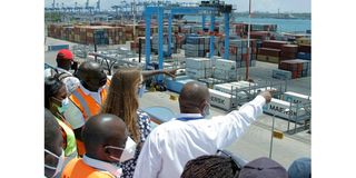 British High Commissioner to Kenya Jane Marriott (centre) is taken through operations at the Kenya Ports Authority (KPA) New Container Terminal by Port Electrical Engineering Matthew Amuti (left). Movement around the Mombasa port is set to improve following the commissioning of two key roads linking the harbour to the Northern Corridor transport route.