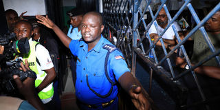Mr Omar Shallo, the United Democratic Alliance (UDA) candidate for the Mvita Parliamentary seat (middle) and Tudor ward MCA candidate Samir Bhalo in police custody at the Makupa police station.