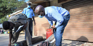Kenya National Highways Authority (KeNHA) Coast Regional Deputy Director Howard M’mayi (right) looks at a gas cylinder believed to have been used to vandalize the Makupa Bridge after raiding two scrap metal dealers along Mbaraki area on Thursday afternoon
