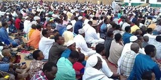 Muslims faithful gather at Tononoka Grounds in Mombasa on June 4, 2019 for Idd prayers. A section of Muslim faithful have defied Kenya's Chief Kadhi Ahmed Muhdhar’s advice to mark Idd-ul-Fitr on Wednesday.
