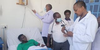 James Irungu, a young man in Murang’a who was attempting to hug a tree for 80 hours in his quest to raise cancer awareness is attended to by doctors at Murang’a County referral hospital, where he is under 24-hour doctor observation.