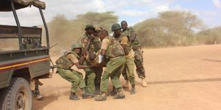 A seriously injured police officer is lifted into a police helicopter at Marigat for treatment in Nairobi on December 22; 2016. The police officer was shot on both legs on patrol when they were ambushed by armed bandits at Noosukro in Baringo South Sub-County.