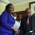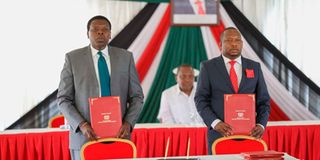 Eugene L. Wamalwa CS Ministry of Devolution and former Nairobi Governor Mike Gideon Mbuvi Sonko during the signing of an addendum to Deed of Transfer of Services at State House, Nairobi.