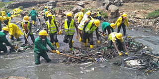 Nairobi County workers clean up a section of Nairobi River on May 15, 2019. PHOTO | COLLINS OMULO | NATION MEDIA GROUP