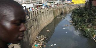 A man looks at the polluted Nairobi River. City residents have said that the Kidero-led county government is not doing enough to clean up the river and ensure that those who pollute it are punished.