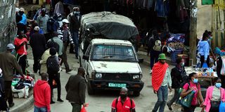 City residents walk past a Nairobi City County pickup belonging to the County Enforcement Department on the corner of Latema Road and River Road.