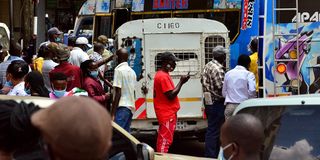 Nairobi City County officials hang around a pickup belonging to their County Enforcement Department outside the fire station along Tom Mboya Street. The vehicle is used by County Askaris to in the arrest of hawkers and other law breakers.