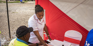 A healthcare professional monitors patient's blood pressure during a check-up at the free medical camp in Kasarani organized by 3 Rotary Clubs in Nairobi.