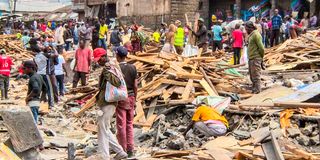 Traders rummage through the ruins as they try to salvage their belongings on March 31, 2026 after a section of Gikomba Market was demolished on Monday night by authorities.