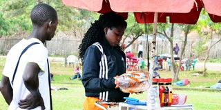 Phelestine Muranji, a smokie vendor attends to a customer at Uhuru Park as she awaits the reopening of the park.