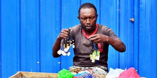 “I have never been employed and this (business) is what I have known as my livelihood. The past three months have been tough. Like today, you are the first person I am selling to,” he says as he makes me two bead wrist bands, each for Sh100.