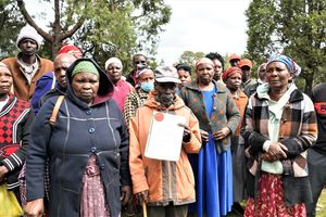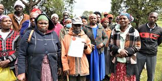 Surviving members of Wareng/Nyakinyua display the main title deed of their 80-acre piece of land located in the outskirt of Eldoret town given to them by founding father of the nation Mzee Jomo Kenyatta. The land is estimated to be worth Sh800 million