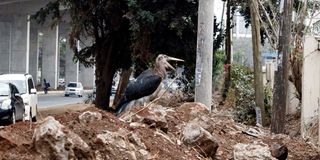 A marabou stork in a picture taken on November 24, 2021, standing forlornly outside the fenced Uhuru Park which is currently undergoing rehabilitation by the Nairobi Metropolitan Services (NMS).