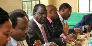 Cord leaders Kalonzo Musyoka (second left), Raila Odinga (third left) and Moses Wetang'ula (right) share a 'peace meal' with Jubilee coalition MP Moses Kuria (second right) at a popular restaurant in Nairobi, Ranalo Foods, on June 21, 2016. Mr Odinga agreed to meet with seven MPs who had been arrested for alleged hate speech and detained in police cells for several days. The leaders vowed to work together to unite all Kenyans.