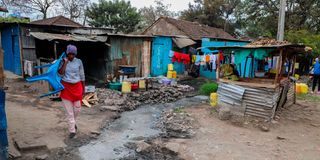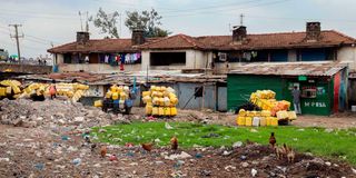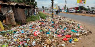 Garbage strewn at the entrance of Kaloleni in Nairobi County, located approximately 3 kilometers southeast of Nairobi's Central Business District (CBD).