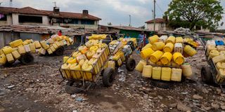 Water vendors in Kaloleni Estate, Nairobi County, sell water at Sh5 per 20-litre jerrycan on Thursday, September 11, 2025, providing a crucial lifeline in a community grappling with persistent water shortages and supply crises.
