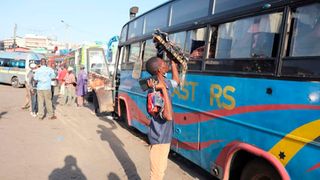 A hawker selling his merchandise to travelers at Machakos Country bus terminal in Nairobi in this picture taken on March 25, 2021.