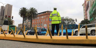 A traffic police officer stands next to a barrier on a road in Nairobi.