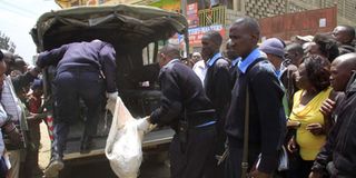 Police officers carry body parts of a victim of crime wave at Bee Center in Kayole estate Nairobi on August 24, 2016.