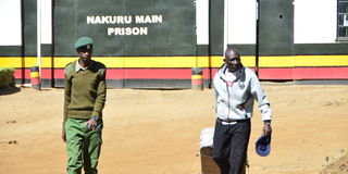 Joseph Kagethe is escorted out of Nakuru Main Prison where he served 20 years.