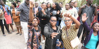 Staff of the Nakuru War Memorial Hospital celebrate after the Environment and Lands Court stopped the county government from taking over the facility's management on October 31, 2023.