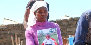 Ms Celestine Anyona holds the portrait of her son Isaac Francis who went missing from their home in Kiratina, Nakuru County on October 4, 2025 only to be found dead two weeks later.