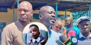 Faraj Ibrahim, father of the thrtee-year-old Faiz Faraj (inset) address the media on the mysterious death of his son while at Gilgil Hills Academy in Nakuru County on Friday. The family is demanding justice.