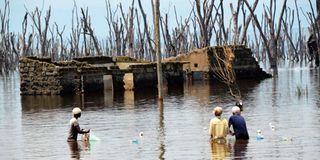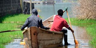 Young men on a fishing expedition in the swollen Lake Nakuru, whose waters have submerged houses in Mwariki, Nakuru West Sub-county, following heavy rainfall on September 4, 2025.