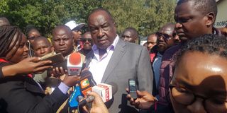 Raymond Moi speaking at Mercy Njeri polling station in Rongai after parliamentary seat elections were suspended due to ballot paper mix up