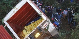 One person was seriously injured when this truck in which he was travelling lost control and landed in a ditch after hitting a tree in Elburgon Town along the Nakuru-Molo road on January 23, 2018. PHOTO | JOHN NJOROGE | NATION MEDIA GROUP
