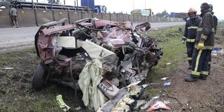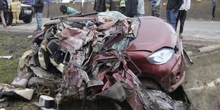The wreckage of a salon car that was hit from the rear side by the Coast Bus at Migaa blackspot along the Nakuru - Eldoret highway on August 20, 2024.