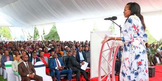Nakuru Governor Susan Kihika delivers her speech during the launch of the Nakuru County enterprise and co-operative revolving development funds at ATC Soilo on May 29, 2025. She said her government has so far disbursed Sh100 million.