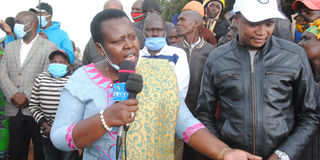 Nakuru Woman Rep Liza Cherule addresses residents of Kapsinendet in Marioshoni, Nakuru County on July 12, 2020 over the ongoing evictions. PHOTO | JOHN NJOROGE | NATION MEDIA GROUP