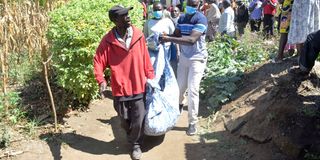 Police, with the help of residents, move the body of Rosemary Wahu from her brother’s house in Nakuru's YMCA Estate on March 6, 2024.