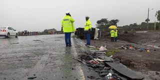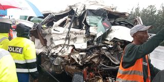 The wreckage of a 14-seater matatu that collided head-on with a trailer in Ngata area on the Nakuru-Eldoret highway.