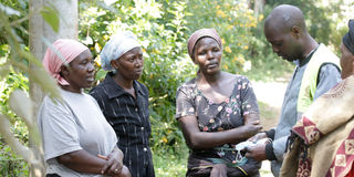 An officer from the Directorate of Criminal Investigations (second right) speaks to Nyakiambi Farm residents at the crime scene where a 16-year-old Form Three student killed his mother in Elburgon, Nakuru County, on July 27, 2025.