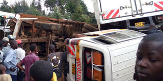 The wreckage of the lorries, matatu and a motorcycle at the scene of accident on August 15, 2016 where two people died on the spot. PHOTO | MAGDALENE WANJA | NATION MEDIA GROUP